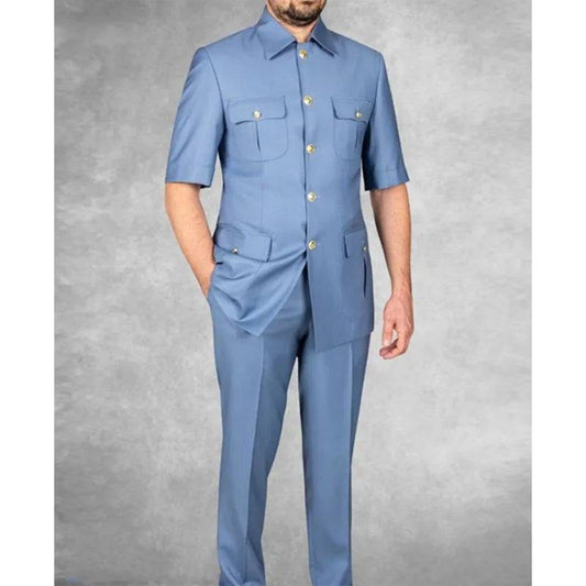 Men's Blazers Suits Short Sleeves Lapel Collar Single Breasted Shirt & Pants 2Pcs