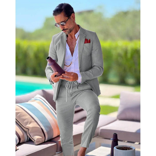 Men's Linen single breasted suit two-piece slim fit casual business wedding groom