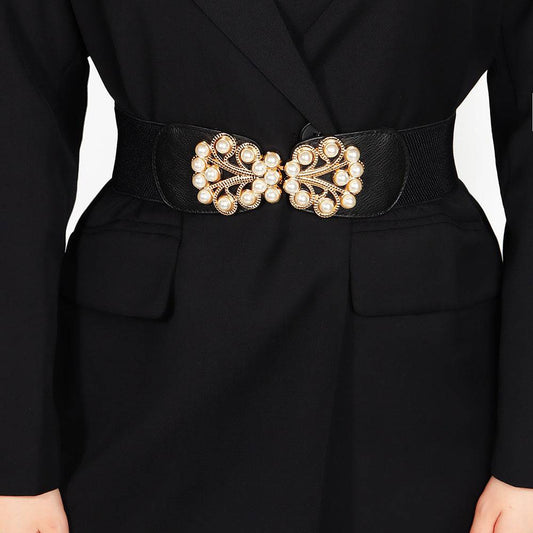 Elegant Ladies Elastic Wide Belt Pearl Metal Buckle