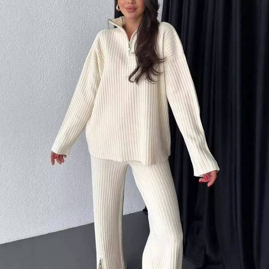 Women's Zipper Knitting Suit High Neck Ribbing Two-Piece Set